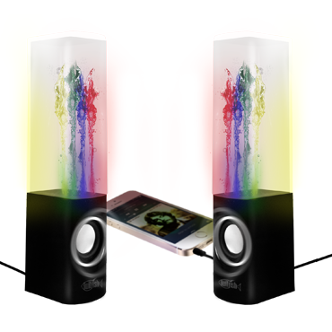 Powered by a single USB cable these unique Disco Fountain Speakers are the perfect desktop speaker for your laptop, tablet and smartphone. Each speaker spurts 4 jets of water illuminated by multi-coloured LEDs to the beat of the music, creating a unique water display. The speakers look fantastic in the dark and the LEDs are bright enough to be seen during the day too, making them great for all day use.