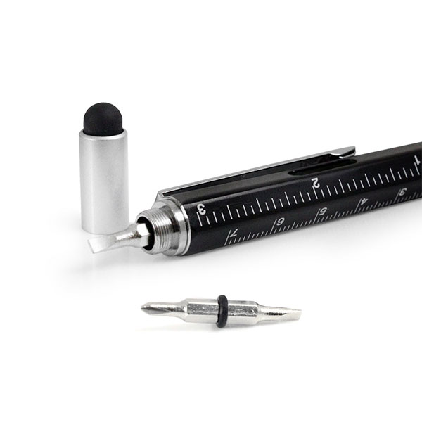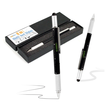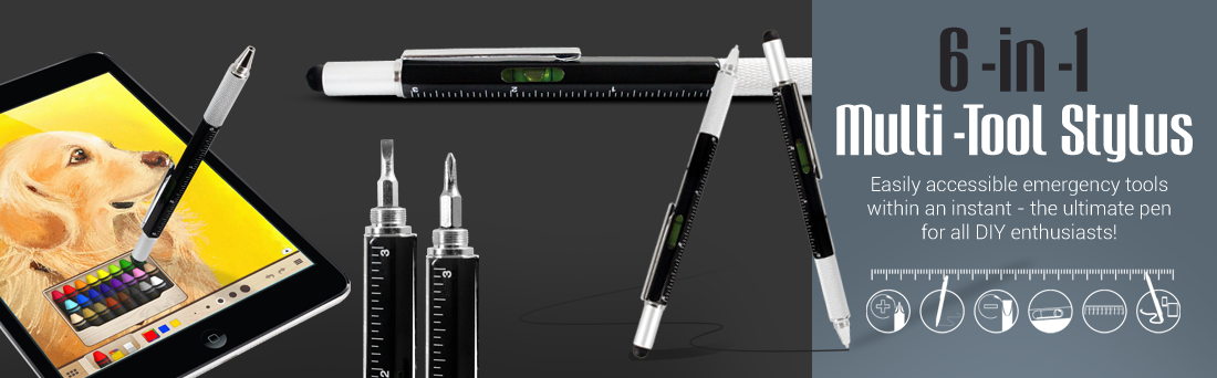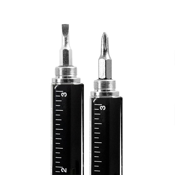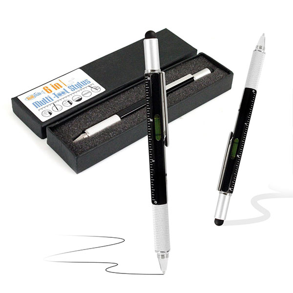 The 6 in 1 Multi Tool Stylus is a must have multi-functional gadget pen suitable for writing on paper and using with your mobile device. With a ballpoint pen at one end and a stylus tip at the other, the pen is perfect for making notes on paper and also drawing on your tablet or smartphone. Unscrewing the stylus lid reveals a two-ended screwdriver. A flat head and a crosshead tip. The pen also features markers and detailing of a ruler in centimetres and inches. Lastly at the centre of the pen is a spirit leveller, the perfect tool for ensuring objects are aligned accurately.