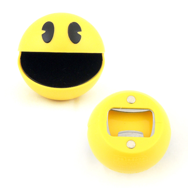 Pac-Man Bottle Opener, undoubtedly the coolest bottle opener around.Shaped just like the Pac-Man character with his distinctive eyes and open mouth, the Pac-Man Bottle Opener is guaranteed to be a conversation starter at any party. His distinctive yellow body and black eyes and mouth means he'll really stand out in your kitchen drawer. However, you probably won't want to hide him away so two small magnets have been incorporated onto the back of the bottle opener allowing him to be attached conveniently to your fridge door. Sturdily built the Pac-Man bottle opener measures 55 mm in diameter and is a fantastic little kitchen tool.